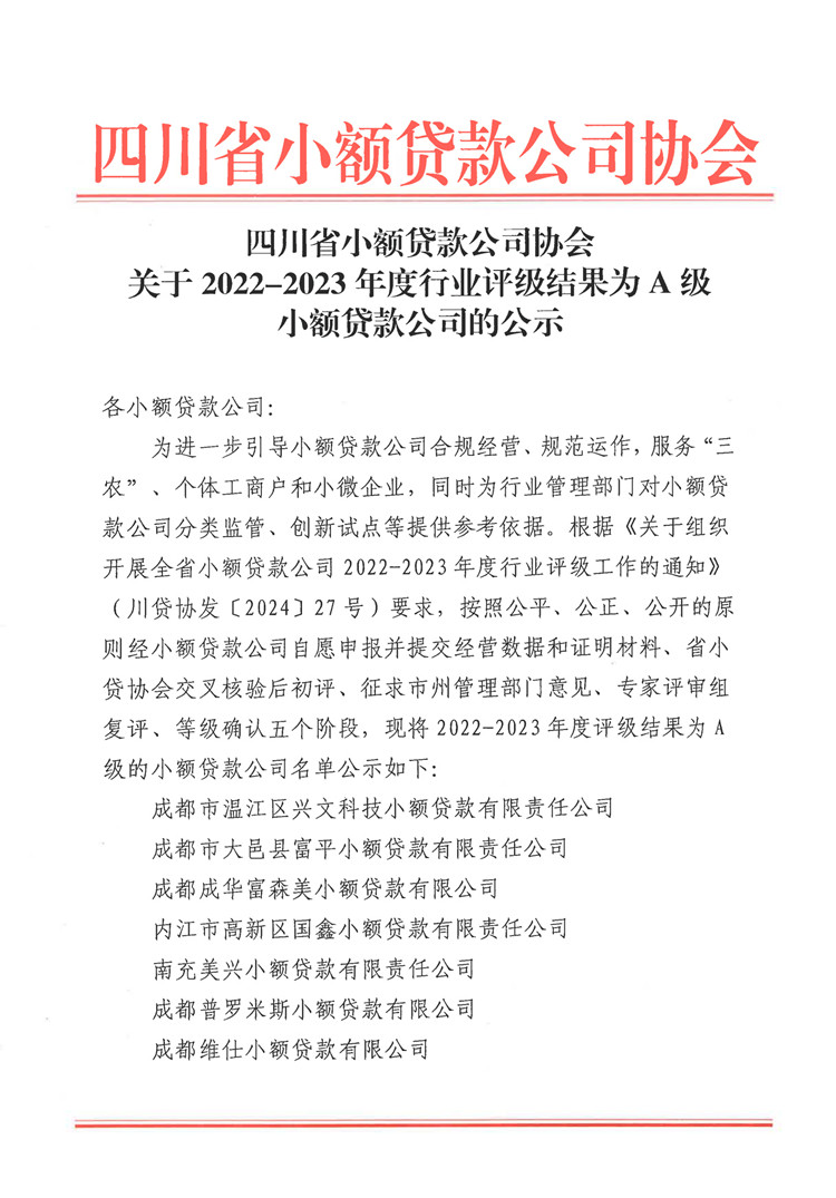 下一篇:關(guān)于四川省小額貸款公司2022-2023年度行業(yè)評(píng)級(jí)A級(jí)公司的公告